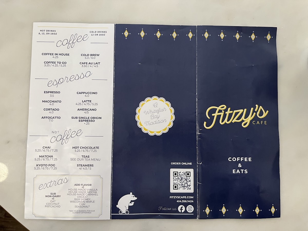 Welcome to Fitzy's Cafe, a cozy gem nestled in Whitefish Bay, WI. This welcoming spot serves up a delightful menu crafted for both casual diners and discerning palates. Patrons can indulge in an array of refreshing beverages, including robust brewed teas like the English Breakfast and the exotic Dragon Well. Seasonal specialties like Pumpkin Chai and Peach Cobbler Latte elevate the drink offerings, while the pastries, including the zesty Citrus Olive Oil Cake and the intriguing Yuzu Black Sesame Tart, are perfect complements to your morning coffee.